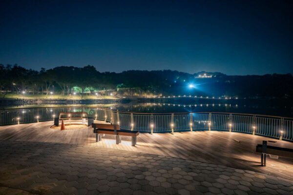 夜晚提供舒適的光環境,照亮整體園區,並依照外圍車道與內部人行步道而區劃成不同的照明系統與照度,滿足晚上的活動安全性,同時也有適合周遭生物棲息的低色溫照明,營造一個適合夜晚光環境活動與生態棲息的空間。