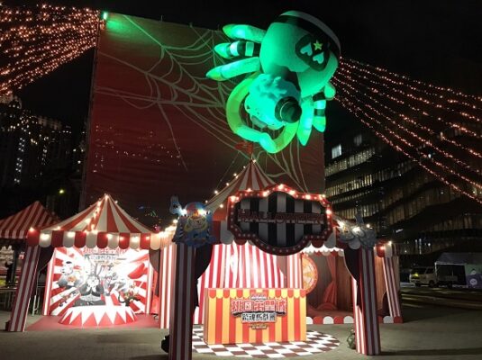 2022搞怪盛會-桃園萬聖城原定10/29開城,因受颱風外圍環流雨勢影響,11/2在桃園藝文廣場正式開城,並延長至11/10,假日中午12點,平日下午4點開始對外服務,每晚6點每半小時將演出一次「驚魂馬戲團」動畫秀,晚間10點為最後一場動畫秀。